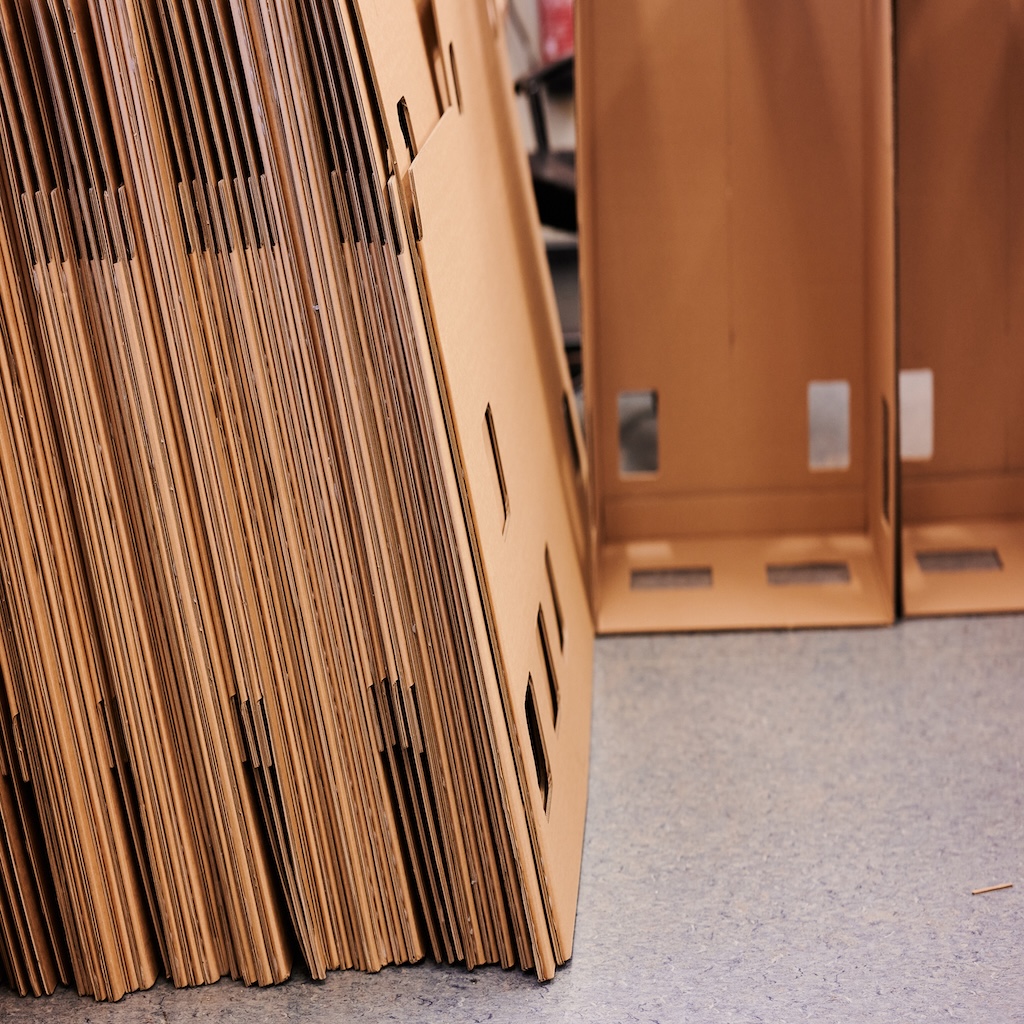 Corrugated cardboard is strong, flexible, and ideal for creating customized packaging solutions. Its natural look and print-friendly surface make it a practical choice for companies seeking both functionality and design appeal. Made from renewable, FSC®-certified materials, it is fully recyclable, free from harmful chemicals, and sourced from responsibly managed forests. Thanks to its lightweight structure and efficient use of space, it helps reduce transport volume and CO₂ emissions. With precise CNC cutting, every sheet of cardboard is used to its fullest — minimizing offcuts and material waste across the entire process.